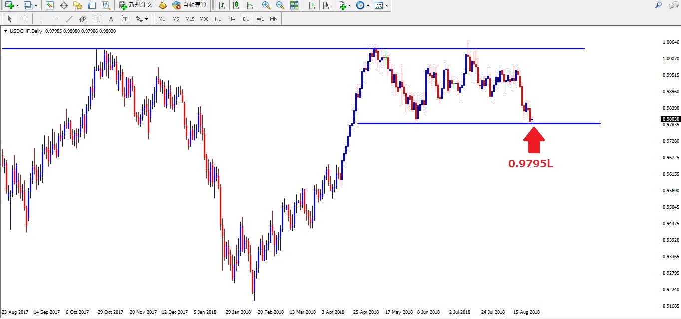 現在ドルスイスフランはボックスレンジの下限にいる状態です。