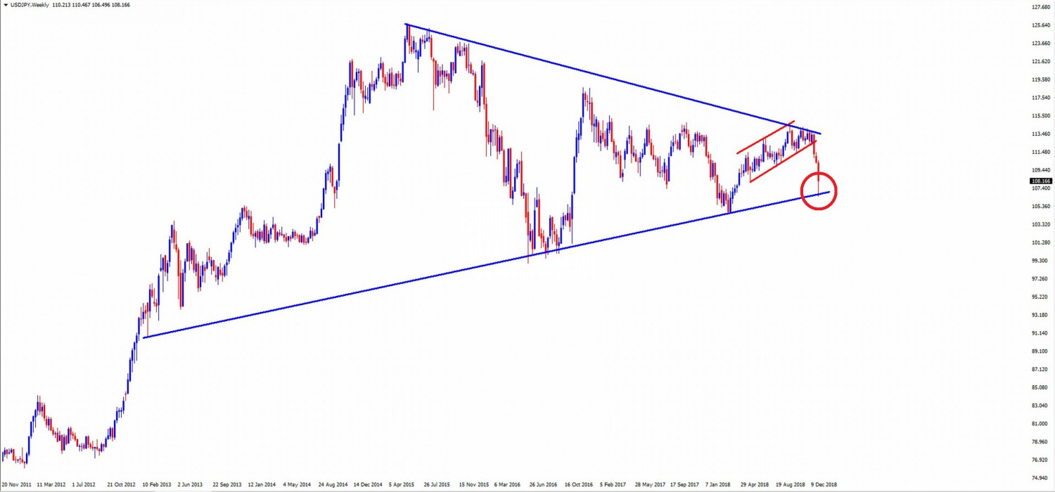 ドル円は以前から予想していたように週足ペナント下限まで大きく下落になりましたね。